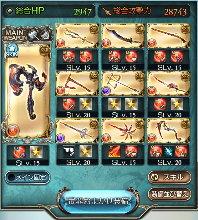 四象武器が3本(夏ノ陽炎、柘榴石の鉞、朱雀光剣)、終末、アスポン、天司、バハ剣、天秤と比較的取得優先度の高い武器、旧マグナ2武器、オッケとドロップしやすい武器で構成されており、編成難易度は低いかと思います。
