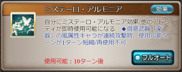 発動は10ターン後ですが、楽器得意キャラが連撃で使用可能ターンを減らせるため、今回のパーティでは比較的すぐに発動することができます。