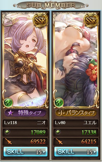 更新によりフロントメンバーが落ちにくくなりましたので、サブメンバーは更新前にも居たニオと、楽器得意枠にしました。